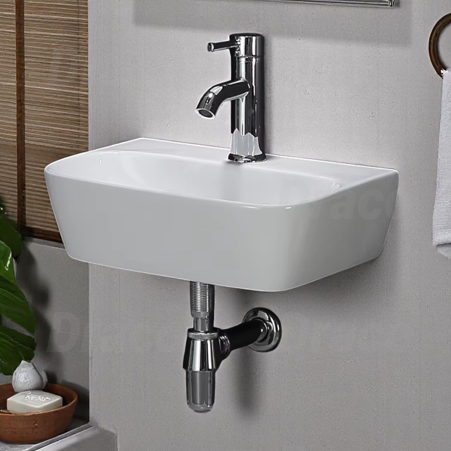 - Đây là mẫu bồn rửa mặt treo tường. Trên thành bồn sẽ được khoét lỗ để lắp vòi nước lavabo.