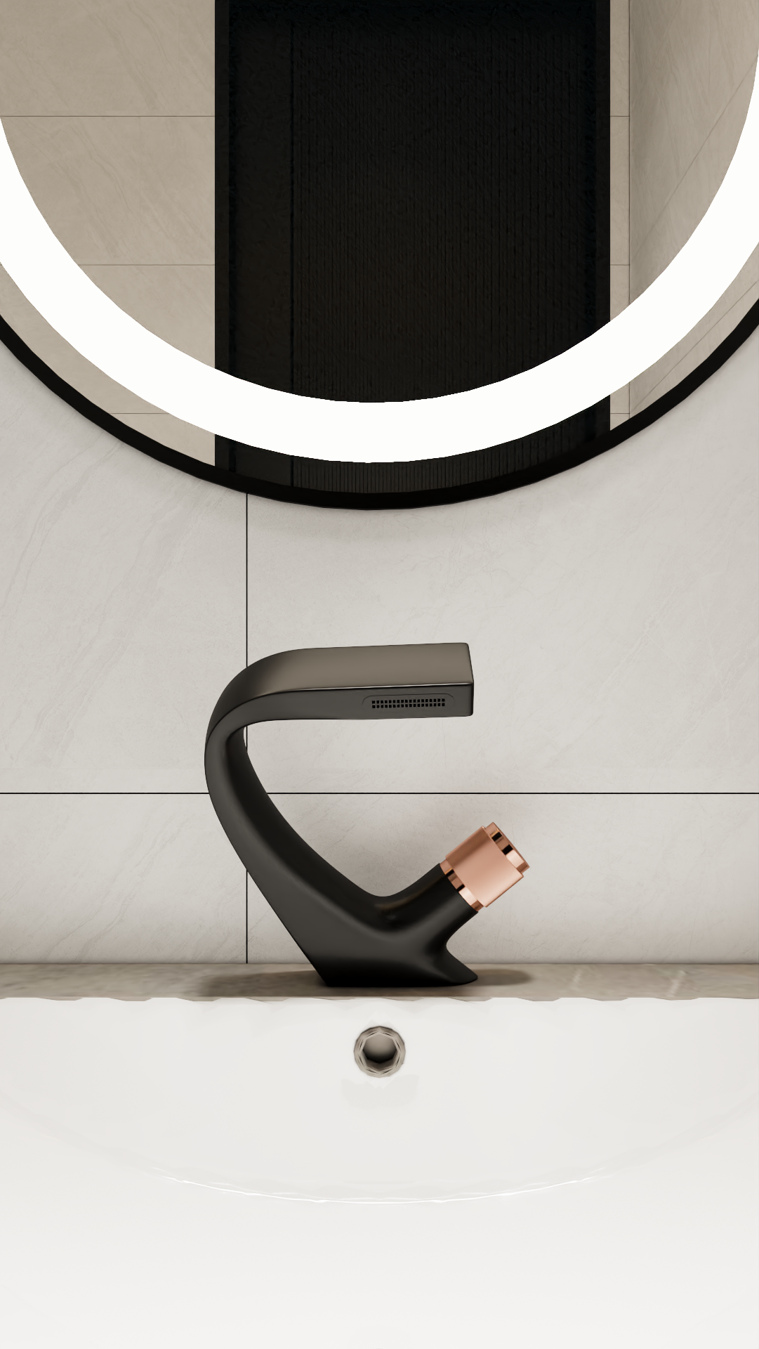 Sen tắm và vòi lavabo bằng đồng thau phủ sơn tĩnh điện đen, kết hợp cùng các chi tiết tinh gọn, sắc sảo tạo nên tổng thể hài hòa, giúp không gian vừa nổi bật cá tính vừa đảm bảo sự tiện nghi và bền bỉ theo thời gian.