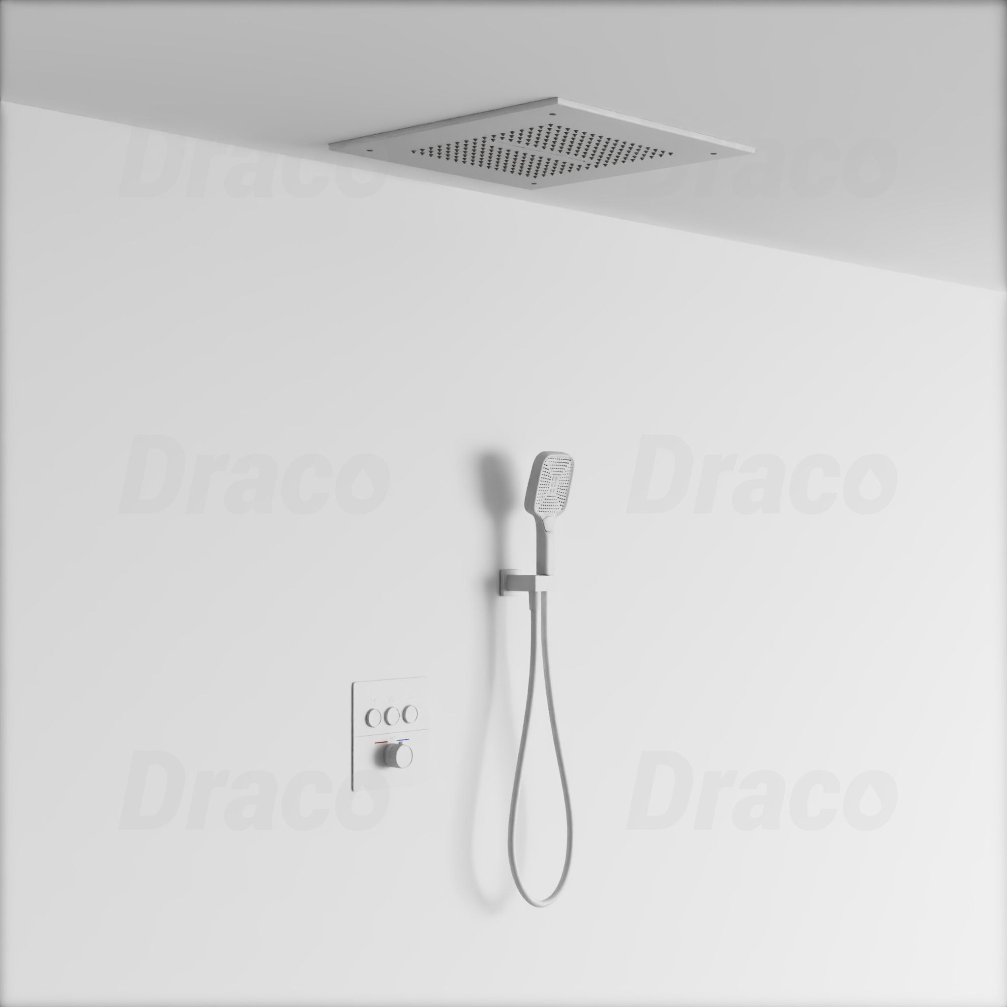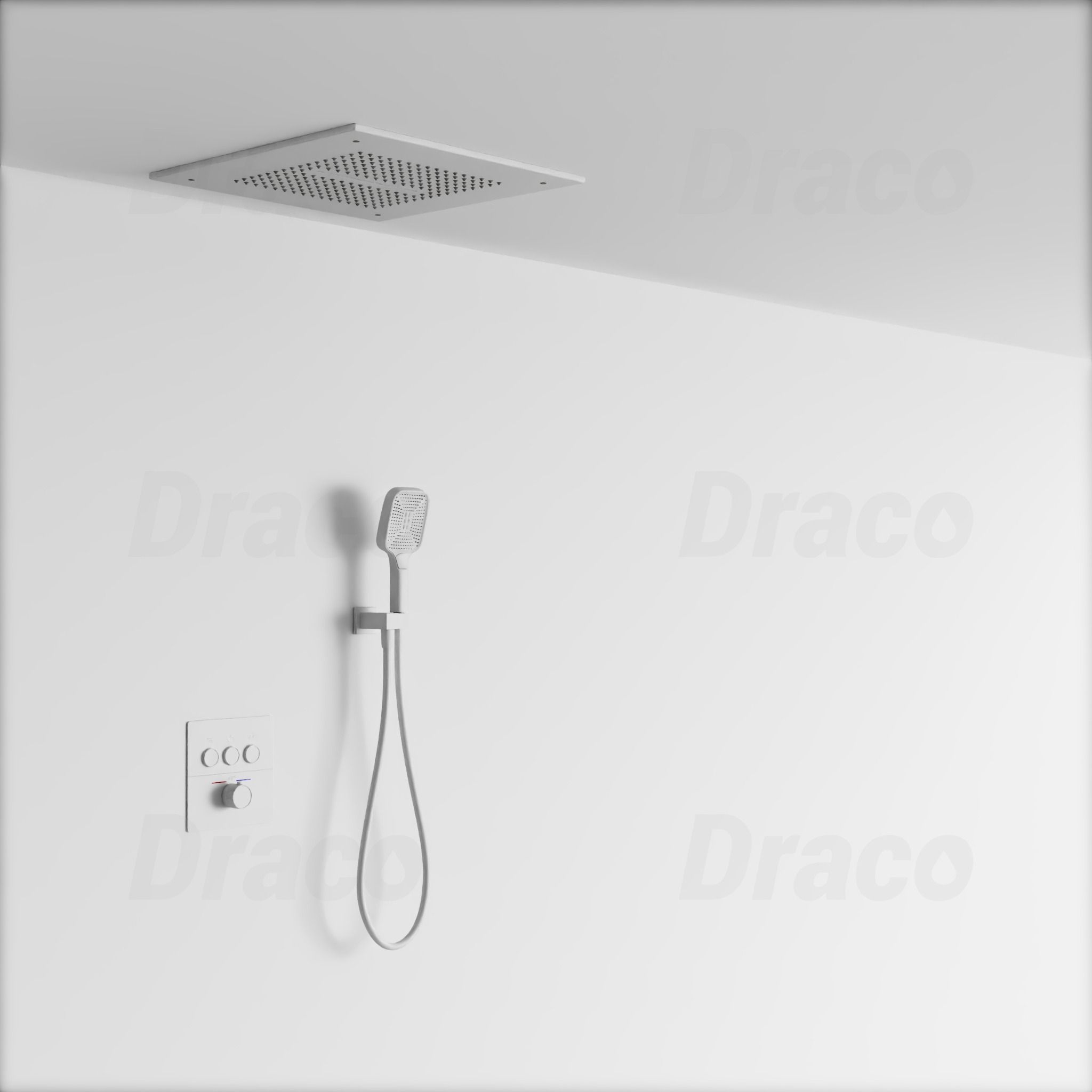Sen Tắm Âm Trần Đồng Thau Dạng Nút Bấm Có Khóa Nhiệt Độ Draco F0390 của thương hiệu Draco - thương hiệu uy tín trong lĩnh vực cung cấp sản phẩm thiết bị vệ sinh là dòng sen tắm cao cấp, mang đến cho người sử dụng cảm giác thoải mái, vui tươi, luôn tràn trề năng lượng. Sen Tắm Âm Trần Đồng Thau Dạng Nút Bấm Có Khóa Nhiệt Độ Draco F0390 được thiết kế hiện đại với mục đích tạo sự thông thoáng và tiết kiệm không gian phòng tắm với kích thước bát sen: 400 x 400mm - độ dày: 29mm. Cách thiết kế thông minh giúp giảm bớt đi việc tiêu tốn diện tích, vì thế loại sen này được lắp đặt âm trần các bộ phận không cần sử dụng đến, và để ra bên ngoài chỉ có bát sen tắm vuông kích thước 40x40cm và vòi sen cầm tay, bảng điều chỉnh nhiệt độ dạng nút bấm cùng khóa nhiệt độ.
